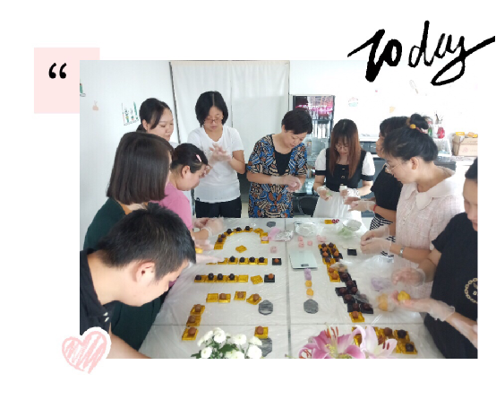 大家根據網上教程按照一揉二包三按的程序開始忙碌起來,有認真按比例配水揉面粉的、有盯著電子秤把準餡料克數的、有一絲不茍搓餡料團子的......待原材料備齊,大家分別挑選自己喜歡的餡料口味進行皮包餡,把包好的冰皮月餅雛形放入模具中,輕輕按壓即可成型脫模。兩個小時的DIY后,餐桌上已經布滿了五彩斑斕、圖案精美的冰皮月餅,有白色的蓮蓉味、金色的奶黃味、黃色的肉松味、紅色的紅豆味,看著親手制作的團圓餅,大家開始美拍曬照,展示自己的勞動成果。