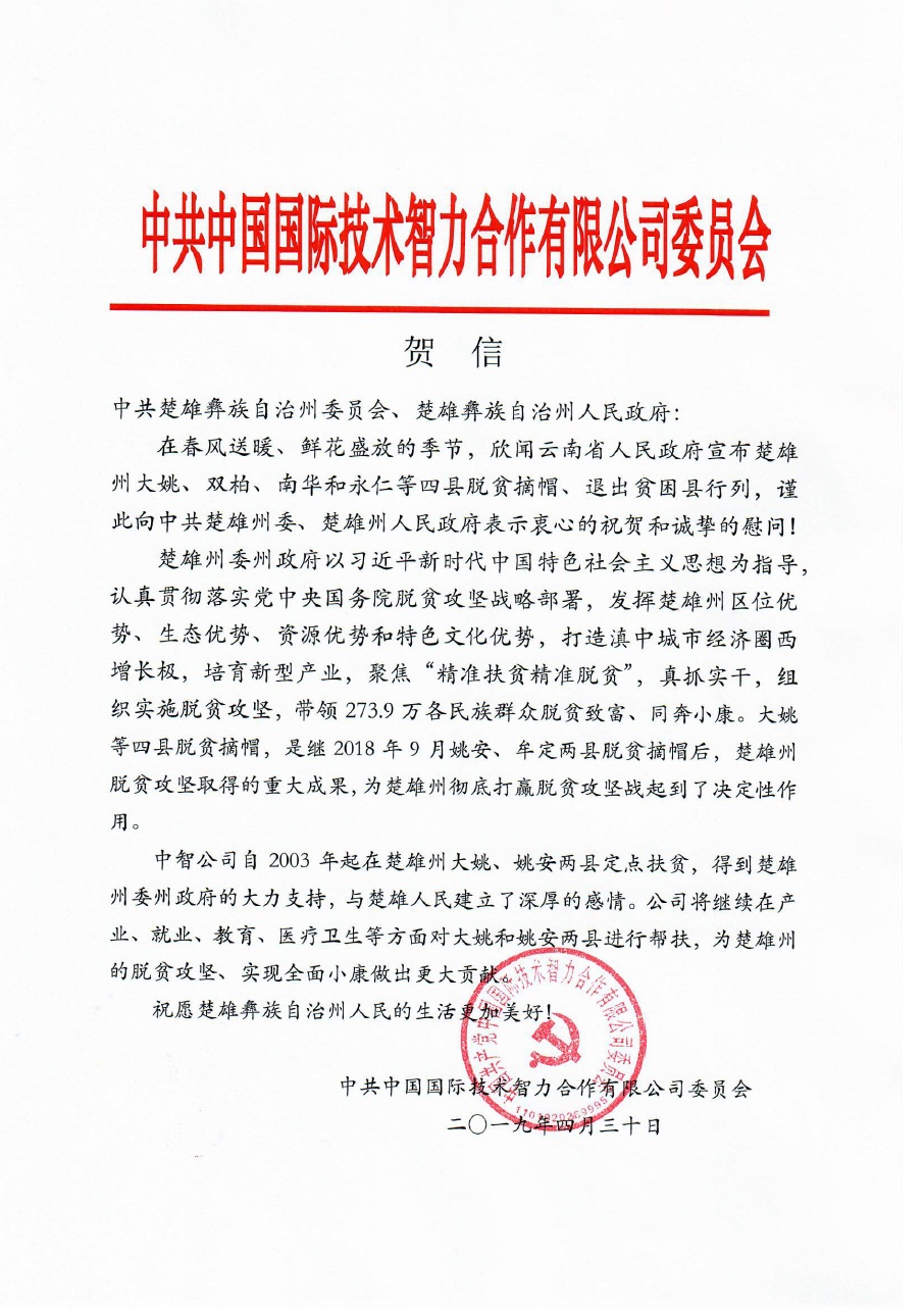 2019年4月30日,云南省人民政府新聞辦在昆明海埂會堂玉蘭廳舉行云南省2018年33個貧困縣(市、區)退出新聞發布會。中智公司定點幫扶的云南省楚雄州大姚縣達到脫貧標準,成功退出貧困序列。