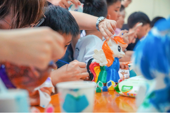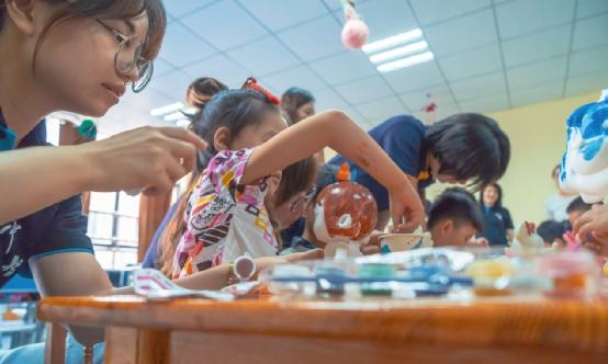 隨后,志愿者們與幼小銜接班的孩子們進(jìn)行了涂鴉互動(dòng)小游戲,志愿者們與孩子們一起結(jié)對(duì),運(yùn)用顏料在儲(chǔ)蓄罐上增添屬于自己的色彩,描繪著孩子們眼中斑斕的世界。孩子們對(duì)于色彩都表現(xiàn)出了極大的樂趣,有照著圖示一步步描繪的,有天馬行空隨意搭配的,也有跳脫畫筆,用手掌創(chuàng)意畫畫的……伴隨著孩子們清脆的笑聲,一個(gè)個(gè)別致的儲(chǔ)蓄罐慢慢成型,我們?cè)谒麄兊难垌锌吹搅怂麄兊氖澜纾哺惺苤麄€(gè)夜空被他們的雙手點(diǎn)亮,如星空般璀璨,如銀河般浩瀚。在歡聲笑語(yǔ)中,此次志愿者活動(dòng)取得了圓滿的成功。